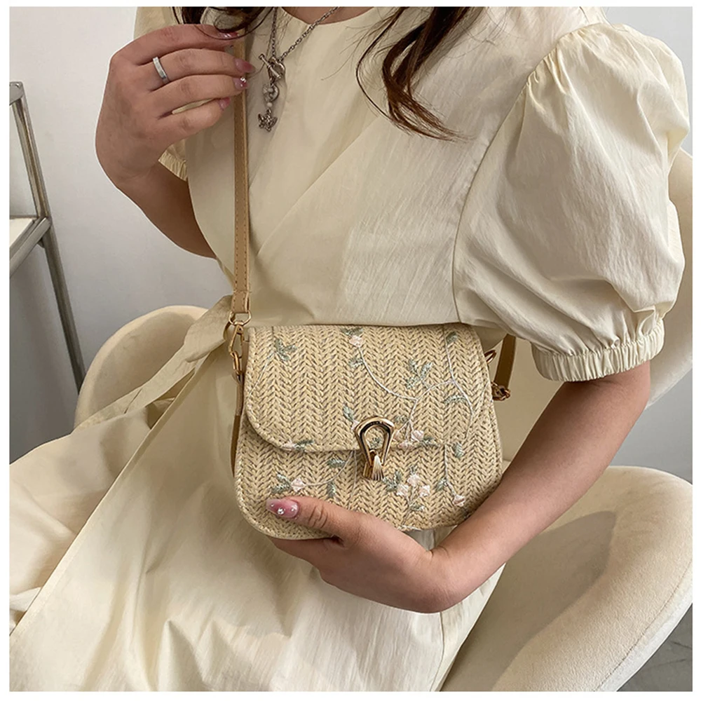 نساء حقائب كتف جديد القش السرج حقائب كروسبودي السيدات ورود للزينة حقائب مربعة الصيف المنسوجة حقائب عالية الجودة